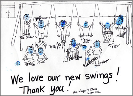 Skidmore & Associates Attend Peace Pole Ceremony and Swing Set Dedication at Herberich Primary School.On September 11, 2003 Herberich Primary School conducted an assembly honoring those men, women and children who were killed in the tragic events of September 11, 2001. Archie and Eric Skidmore attended the ceremony. All of the children gathered outside the main entrance of the school around the ”Peace Poles”. The Peace Poles convey the message “May Peace Prevail on Earth” in sixteen languages. The children sang patriotic songs in honor of the event. “The weather was beautiful that day, couldn’t have been better,” said Archie Skidmore. “It was wonderful to hear them sing,” he added. The Peace Pole assembly was combined with a dedication of the new swing set project. Skidmore & Associates, Veterans of Foreign Wars Post 7971 (Copley, Ohio) and others contributed to the project. The equipment included new swings that are accessible to multiple-handicapped students. “We received such a warm reception from the children and faculty,” Eric Skidmore said. “We got to tour some of the school facilities and meet some of the students who had played on the swings. They were grinning from ear to ear,” he said. “We received a “Thank You” print from the children in Mrs. Kasper’s class. There’s a caricature of the children and the teachers. Each child certified the drawing with a fingerprint and signature. It’s displayed in my office, so everyone can admire it,” he added.
